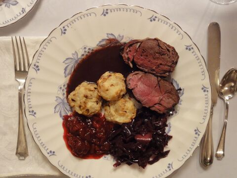 Deer-hunting season has been over for a month or two now, but for many hunters’ families there’s still plenty of deer (not to mention elk, moose, caribou, and antelope) venison in the freezer. And for the rest of us there is now available on the U.S. market a nice selection of both wild and farm-raised venison. The well-stocked Cambridge, MA market Savenor’s was the source of the gorgeous loin of venison we used in our recreation of Markham’s dish. The meat was pricey (about twenty dollars a pound), but far less expensive than a venison dinner for two in a fancy restaurant—and it provided enough meat for six to eight servings. For a special occasion meal, especially when company’s coming, this dish is an absolute knockout. It’s also quite easy to prepare.